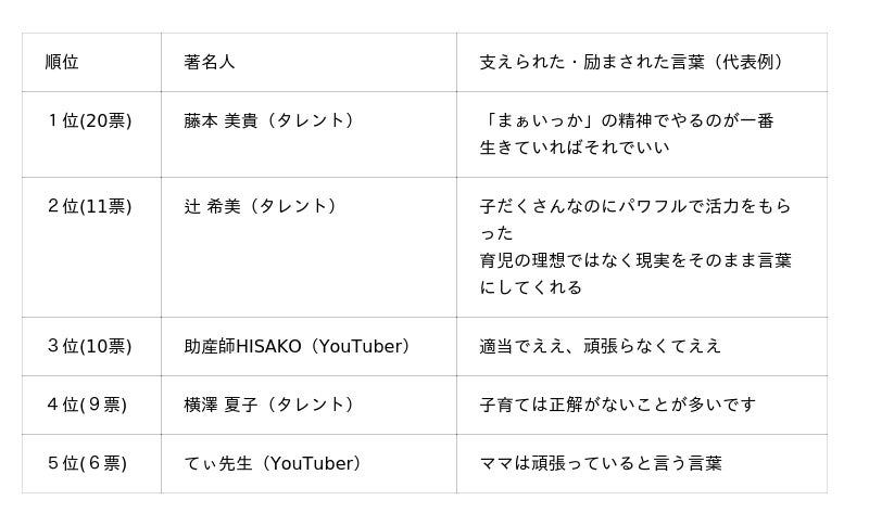 さらに、「支えられた・励まされた」著名人の言動として、タレントの藤本美貴さんに関するエピソードが20件も寄せられました。「子育ては“まぁいっか”の精神でやるのが一番」「育休中にキャリアが止まることはしょうがなくない?」「生きていればそれでいい」といった発言に共感し、励まされた方が多いようです。