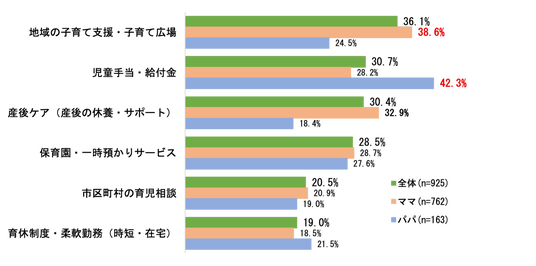 次に、社会からの子育て支援の観点から“愛情以外”に重要だと思う要素を聞いたところ、「体力」56.5%や「時間」54.2%を大きく引き離して、1位は「お金」77.5%という結果になりました。実際、パパの42.3%は「思ったより役に立った」支援として「児童手当・給付金」をトップに挙げています。ママからは「地域の子育て支援・子育て広場」が38.6%と高い数字になりました。