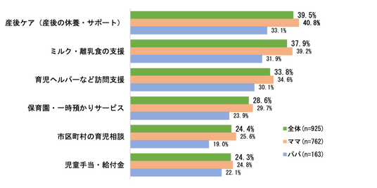 一方で、「トモイク」を実現する上で重要な国や地域・企業が提供する制度やサービスにおいて、知られていない支援も多く、「産後ケア」「ミルク・離乳食の支援」「育児ヘルパーなど訪問支援」はそれぞれ3人に1人が「出産前によく知らなかった」と回答しています。特に「産後ケア(産後の休養・サポート)」はママの40.8%が「よく知らなかった」ものの、32.9%は「思ったより役に立った」支援と感じています。