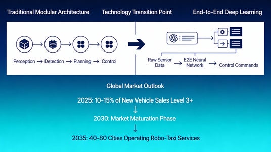 特に、エンドツーエンド深層学習への技術転換、ロボタクシー商用化の加速(2035年までに40~80都市)、電動化との統合、ならびに次世代チップ・AI処理能力の向上が、市場拡大の主要なドライバーです。