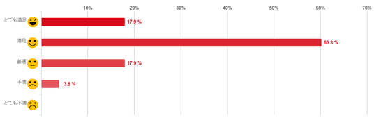 「満足」と回答した人が60.3%となり、6割を超え最も多く、「とても満足」との回答と合わせると約8割の人が満足していることがわかった。反対に、「不満」と回答した人は3.8%と僅かで「とても不満」と回答した人はいなかった。