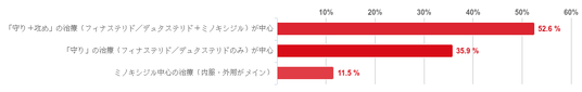 「「守り+攻め」の治療(フィナステリド/デュタステリド+ミノキシジル)が中心」と回答した人が52.6%で最も多く、次いで「「守り」の治療(フィナステリド/デュタステリドのみ)が中心」(35.9%)、「ミノキシジル中心の治療(内服・外用がメイン)」(11.5%)という順となった。