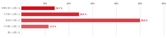 「妥当だと感じる」と回答した人が50.0%と回答者の半数を占め最も多く、次に「やや安いと感じる」との回答が24.4%となり、「非常に安いと感じる」(14.1%)と回答した人を合わせると9割近い人がレバクリのAGA治療の料金設定に納得していることがわかった。なお、「やや高いと感じる」と回答した人は少数で「高いと感じる」との回答はみられなかった。