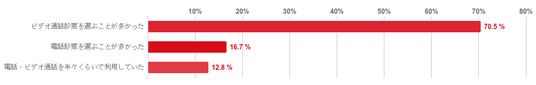 「ビデオ通話診察を選ぶことが多かった」と回答した人が70.5%と圧倒的に多く、回答者の7割以上がビデオ通話診察を選択していることがわかった。また、「電話診察を選ぶことが多かった」と回答した人が16.7%、「電話・ビデオ通話を半々くらいで利用していた」との回答が12.8%だった。