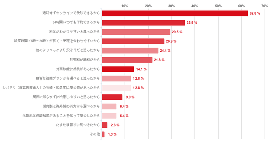 「通院せずオンラインで受診できるから」と回答した人が62.8%で最も多く、次いで、「24時間いつでも予約できるから」(35.9%)、「料金がわかりやすいと思ったから」(29.5%)、「診察時間(8時~26時)が長く、予定を合わせやすいから」(26.9%)という順で並んだ。