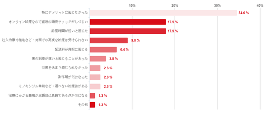 「特にデメリットは感じなかった」と回答した人が34.6%で最も多かった。なお、デメリットとしてあがった回答として「オンライン診療なので直接の頭皮チェックがしづらい」と「診察時間が短いと感じた」が共に17.9%で最も多かった。
