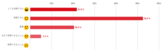 「信頼できた」と回答した人が52.6%で過半数となり最も多く、「とても信頼できた」(21.8%)との回答と合わせると7割以上の人が医師の説明や対応について「信頼できた」と感じていることがわかった。反対に、「あまり信頼できなかった」と回答した人は5.1%と僅かだった。