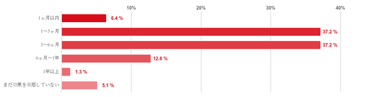 「1~3ヶ月」、「3~6ヶ月」と回答した人が共に37.2%で最も多く、回答者の7割以上が「1~6ヶ月」で治療の効果を実感し始めていることがわかった。また、「6ヶ月~1年」との回答が12.8%で続き、「1年以上」と回答した人は1.3%と僅かだった。