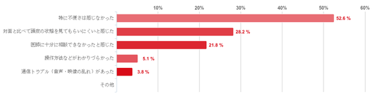 「特に不便さは感じなかった」と回答した人が52.6%で最も多かったが、そのほか、「対面と比べて頭皮の状態を見てもらいにくいと感じた」との回答が28.2%、「医師に十分に相談できなかったと感じた」が21.8%と一定数みられた。