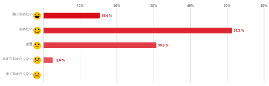 「勧めたい」と回答した人が51.3%で、過半数となり最も多く、「強く勧めたい」(15.4%)との回答と合わせると7割近くの人が薄毛で悩んでいる友人や家族などにレバクリを勧めたいと思っていることがわかった。反対に、「あまり勧めたくない」と回答した人は2.6%と僅かで「全く勧めたくない」と回答した人はいなかった。