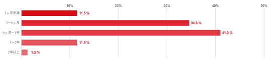 「6ヶ月~1年」と回答した人が41.0%で最も多く、次に「3~6ヶ月」との回答が34.6%で回答者の7割以上の治療期間が「3か月~1年未満」ということがわかった。