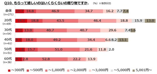 ・もらって嬉しい贈り物の金額は「~1,000円」が47%で最多で、次いで「~2,000円」が35%。