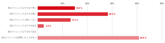 「他のクリニックを利用したことがない」と回答した人が40.8%で最も多かったが、「他のクリニックよりやや良い」と回答した人が28.3%、次いで「他のクリニックよりかなり良い」が15.0%で続き、他のクリニックよりも良いと感じている人が多いことがわかった。そのほか、「他のクリニックと同じくらい」と回答した人が13.3%%、「他のクリニックよりやや劣る」との回答が2.5%で「他のクリニックよりかなり劣る」と回答した人はいなかった。