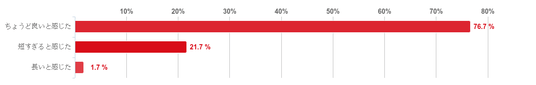 「ちょうど良いと感じた」との回答が76.7%で圧倒的に多く、「短すぎると感じた」(21.7%)との回答数を大きく上回った。反対に、「長いと感じた」と回答した人は1.7%と僅かだった。