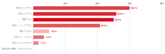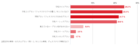 「発毛ライトプラン」と回答した人が24.2%で最も多く、次いで「発毛ミニプラン」との回答が23.7%、「予防プラン」が21.7%、「発毛ベーシックプラン」が20.8%と共に2割程度で続いた。そのほか、「発毛スマートプラン」(2.5%)や「発毛ストロングプラン」(1.7%)との回答は僅かとなった。