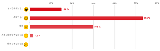 「信頼できた」と回答した人が53.3%で過半数となり最も多く、「とても信頼できた」(15.0%)との回答と合わせると約7割の人が医師の説明や対応について「信頼できた」と感じていることがわかった。反対に、「あまり信頼できなかった」と回答した人は1.7%と僅かとなり、「信頼できなかった」と回答した人はいなかった。