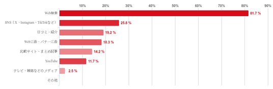 「Web検索(GoogleやYahoo!など)」と回答した人が81.7%で圧倒的に多く、次いで「SNS(X、Instagram、TikTokなど)」(25.8%)、「口コミ・知人の紹介」(19.2%)という順となった。