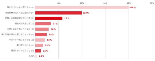 「特にデメリットは感じなかった」と回答した人が40.0%で最も多かった。なお、デメリットとしてあがった回答として「対面診療に比べて安心感が少ない」が20.0%で最も多く、そのほか「医師との対話時間が短いと感じた」や「配送料が負担に感じる」と回答した人がみられた。