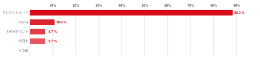 「クレジットカード」と回答した人が88.3%で圧倒的に多く、回答者のほとんどがクレジットカードで支払いをしていることがわかった。そのほかの「PayPay」「DMMポイント」「代引き」などの回答は僅かだった。