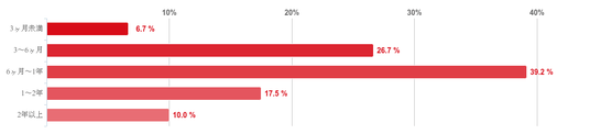 「6か月~1年」と回答した人が39.2%で最も多く、次に「3~6か月」との回答が26.7%、「1~2年」が17.5%という順となった。そのほか、「2年以上」と回答した人は10.0%で、「3か月未満」が6.7%となり、回答者の多くの治療期間が「3か月~2年未満」ということがわかった。