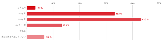「3~6ヶ月」と回答した人が43.3%で最も多く、次に「1~3ヶ月」との回答が33.3%で続き、回答者の約8割が「1~6ヶ月」で治療の効果を実感し始めていることがわかった。また、「1年以上」と回答した人はいなかった。