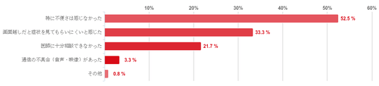 「特に不便さは感じなかった」と回答した人が52.5%で最も多かったが、そのほか、「画面越しだと症状を見てもらいにくいと感じた」との回答が33.3%、「医師に十分相談できなかった」が21.7%と一定数みられた。