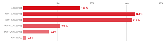 「3,000~5,000円未満」と回答した人が32.5%で最も多く、次いで「5,000~8,000円未満」との回答が31.7%で続いた。そのほか、「3,000円未満」と回答した人が16.7%、「8,000~10,000円未満」との回答が10.8%となり、回答者の6割以上の人の1ヶ月あたりの負担額が「3,000~8,000円未満」だということがわかった。