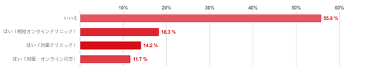 「いいえ」と回答した人が55.8%で半数を超えて最も多かったが、「はい」の回答としては、「はい(他社オンラインクリニック)」(18.3%)、「はい(対面オンラインクリニック)」(14.2%)、「はい(対面・オンライン両方)」(11.7%)という順となった。