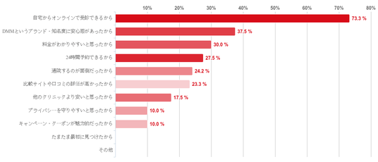 「自宅からオンラインで受診できるから」と回答した人が73.3%で圧倒的に多かった。続いて、「DMMというブランド・知名度に安心感があったから」(37.5%)、「料金がわかりやすいと思ったから」(30.0%)、「24時間予約できるから」(27.5%)という順で並んだ。