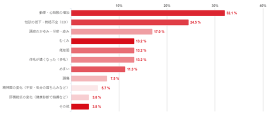 「動悸・心拍数の増加」との回答が共に32.1%で最も多く、次いで「性欲の低下・勃起不全(ED)」との回答が24.5%となった。そのほか、「頭皮のかゆみ・発疹・赤み」(17.0%)、「むくみ」「倦怠感」「体毛が濃くなった(多毛)」(共に13.2%)などの回答も一定数みられた。