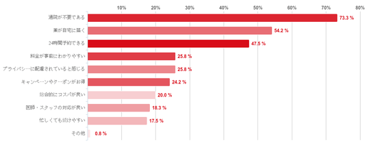 「通院が不要である」との回答が73.3%で最も多く、次に「薬が自宅に届く」との回答が54.2%、「24時間予約できる」が47.5%で続いた。そのほか、「料金が事前にわかりやすい」「プライバシーに配慮されていると感じる」「キャンペーンやクーポンがお得」「総合的にコスパが良い」との回答も2割以上集まった。