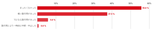 「まったくなかった」と回答した人が55.8%で最も多く、次に「軽い副作用があった」との回答が37.5%、「気になる副作用があった」が5.8%という順となった。また、「副作用により一時的に中断・中止した」との回答は僅かだった。