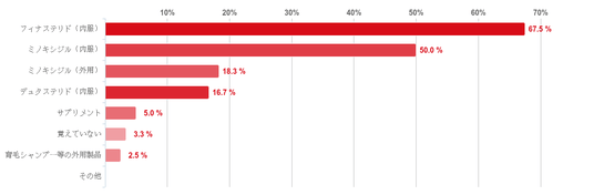 「フィナステリド(内服薬)」と回答した人が67.5%で最も多く、次いで「ミノキシジル(内服)」との回答が50.0%と続き、この二つの回答が多くの割合を占めた。そのほか、「ミノキシジル(外用)」が18.3%、「デュタステリド(内服)」が16.7%と一定数の回答を得た。