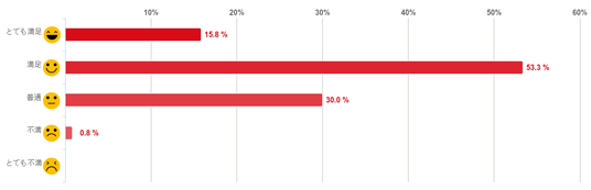 「満足」と回答した人が53.3%となり、約5割で最も多く、「とても満足」との回答と合わせると約7割の人が満足していることがわかった。反対に、「不満」と回答した人は0.8%と僅かで「とても不満」と回答した人はいなかった。