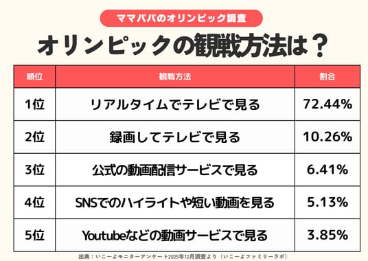 今回の調査から、冬季オリンピックは、観る家庭では「テレビで家族と共有する行事」として楽しまれ、競技体験や食、学びにつなげる“きっかけ”にもなっている傾向が見られました。親子での関心に差があるものの、子どもの興味に寄り添いながら楽しむ様子が見られます。【調査概要】