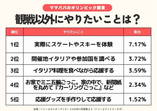 ▶オリンピック観戦、「観ない・未定」が約78%▶ママパパが注目する競技ランキング!「フィギュアスケート」「スノーボード」