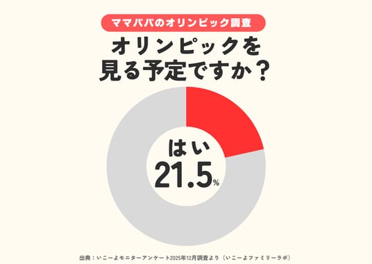 2026年2月6日(金曜日) から 2026年2月22日(日曜日)まで開催されるミラノ・コルティナ2026冬季オリンピックについて、子育て世帯の回答者の約8割が「観戦しない・わからない」と回答。一方、5人に1人は「観る」と積極的に回答しています。