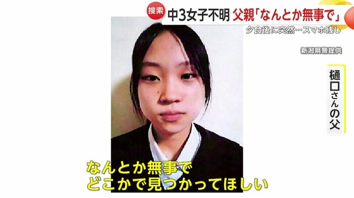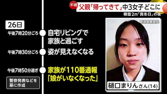 新潟・十日町市の女子中学生・樋口まりんさん(14)が1月26日夜から行方不明になっていて、警察と消防が行方を捜すとともに、関連情報の収集を行っている。