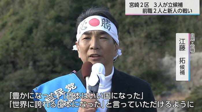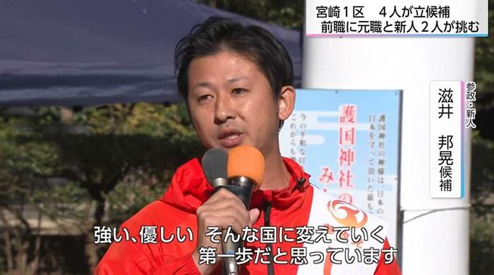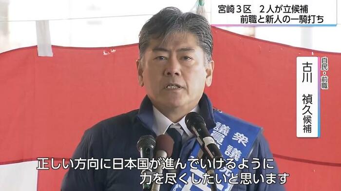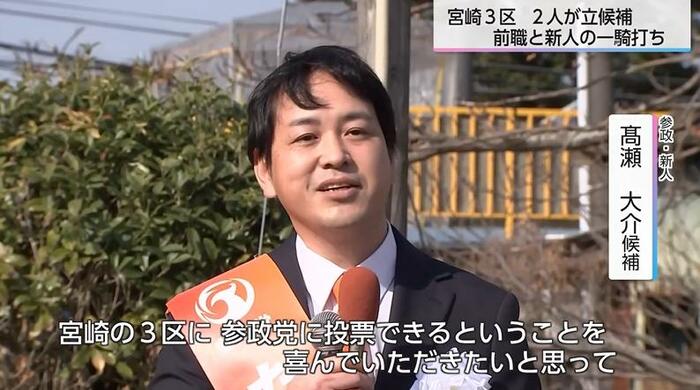 宮崎3区は、前職のみが立候補を表明し、無投票の可能性もささやかれたが、公示直前に参政の新人が立候補を表明し、一転、一騎打ちの選挙戦となった。