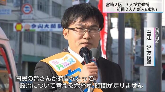 宮崎2区には、前回と同じ3人が立候補した。自民前職と、国民前職(九州比例)が3度目の対決。それに共産の新人が挑む構図だ。