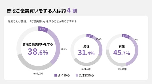 ご褒美買いをすることが「よくある」「たまにある」と回答した人は全体で38.6%でした。男性は31.4%、女性は45.7%であり、女性の方がご褒美買いをする傾向があることがわかりました。