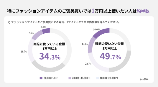 ご褒美買いの対象として「ファッションアイテム」を選んだ人を対象に、実際に使っている金額と理想の金額をたずねたところ、実際に1万円以上を使っている人は全体の34.3%に留まりましたが、理想の支出額として1万円以上を挙げた人は49.7%と、現実と理想のギャップが生じていることが明らかになりました。