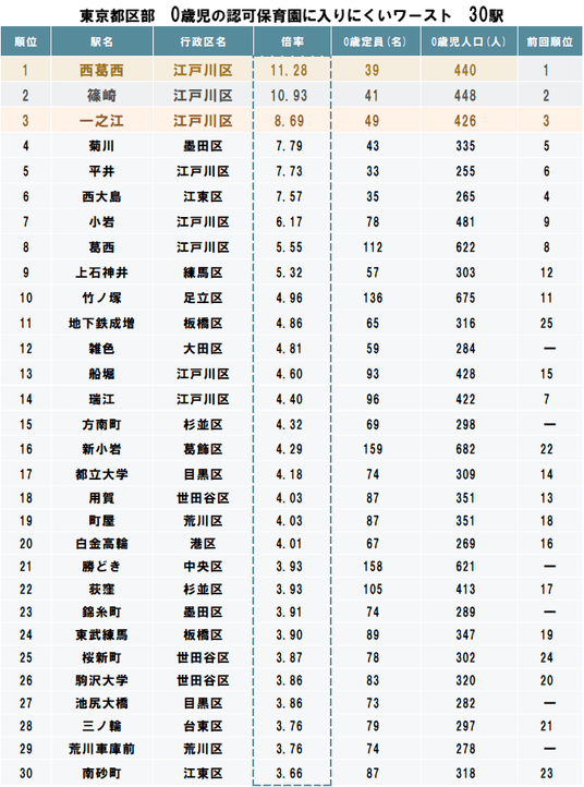 駅別ランキングでは、西葛西駅(江戸川区)が2年連続で最上位となり、0歳児の認可相当保育施設に最も入りにくい駅となっています。同駅では0歳児定員が7.1%減少しており、特に需給の厳しさがさらに強まりました。2位の篠崎駅(同区)は認可相当0歳児定員が増加したものの、未だ高倍率の状況が続いています。
