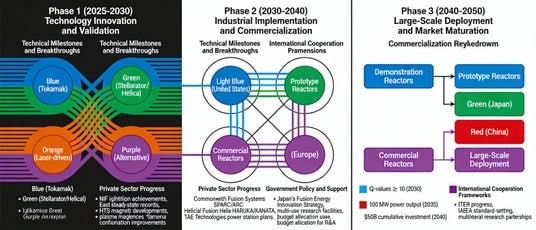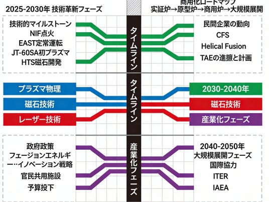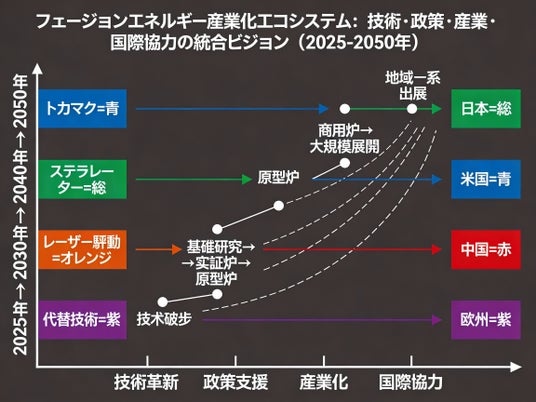● 同時に、Commonwealth Fusion SystemsのARC計画(2030年代初頭グリッド接続目標)、TAE TechnologiesのGoogle・Chevron投資(1.5億ドル)、Helion EnergyのMicrosoft電力購入契約(50MW、2028年予定)など、民間企業による商用化が急ピッチで進行中である。
