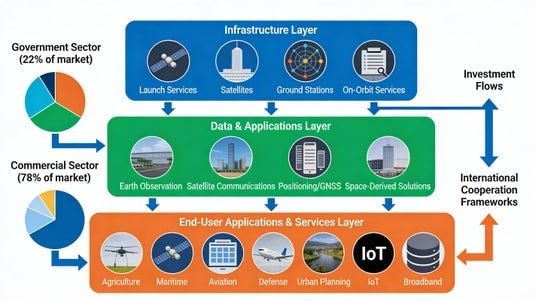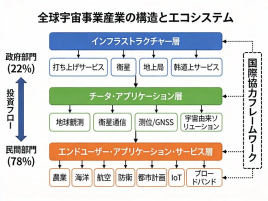 2024年の世界宇宙経済規模が約6,130億ドル(商業セクター78%、政府セクター22%)に達した今、市場は成熟化と再編の局面を迎えている。本白書が描き出すのは、単なる市場規模の拡大ではなく、宇宙産業の根本的な「構造転換」のシナリオである。