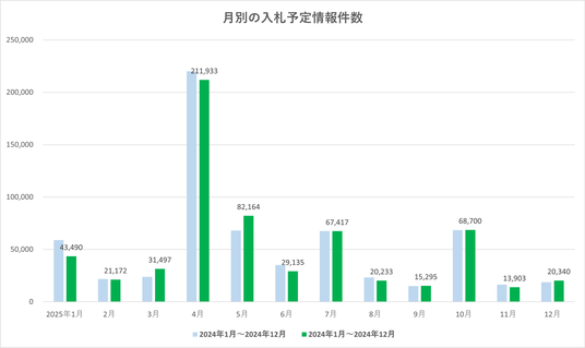 11月は例年、入札予定情報の件数が少ない傾向にありますが、12月は前月から増加し、前年同月を上回る結果となりました。