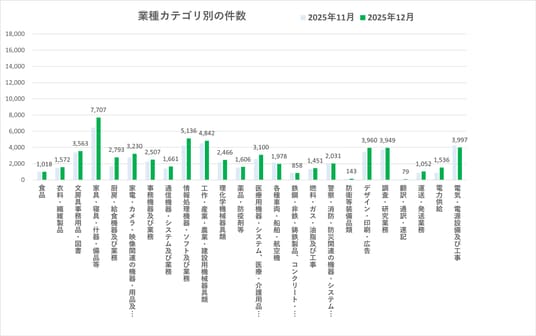 2025年12月の業種別入札件数では、物品・機器・委託系の分野で増加が見られました。「家具・寝具・什器・備品等」は7,707件(前月比119.3%)、「厨房・給食機器及び業務」は2,793件(前月比165.1%)、「情報処理機器・ソフト及び業務」は5,136件(前月比120.5%)と伸びを示しました。