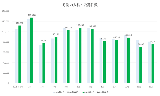 2025年12月の入札・公募件数は76,160件でした。前月(2025年11月:71,036件)から5,124件の増加(前月比107.2%)となり、11月の落ち込みから持ち直しました。一方で、前年同月(2024年12月:80,637件)と比較すると4,477件の減少(前年同月比94.4%)となり、前年をやや下回る水準です。
