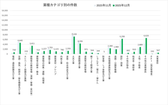 また、「医療用機器・システム、医療・介護用品及び業務」は3,100件(前月比120.0%)、「電力供給」は1,536件(前月比174.9%)、「建物等の維持管理(清掃・警備・受付等)」は3,411件(前月比122.3%)となり、年度末を意識した物品調達や委託業務の増加が数字に表れています。