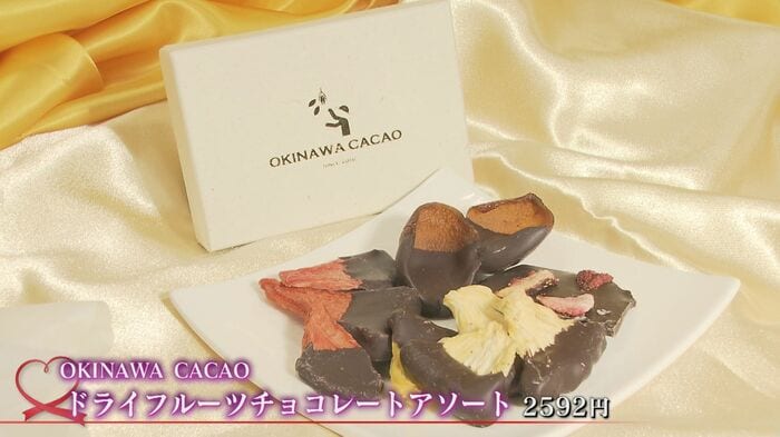 続いて紹介するのは『ドライフルーツチョコレートアソート』(2592円)。沖縄県産のパイナップルやシークワァーサーなどのドライフルーツにチョコレートをコーティングしていて、素材とチョコのハーモニーが楽しめる商品だ。